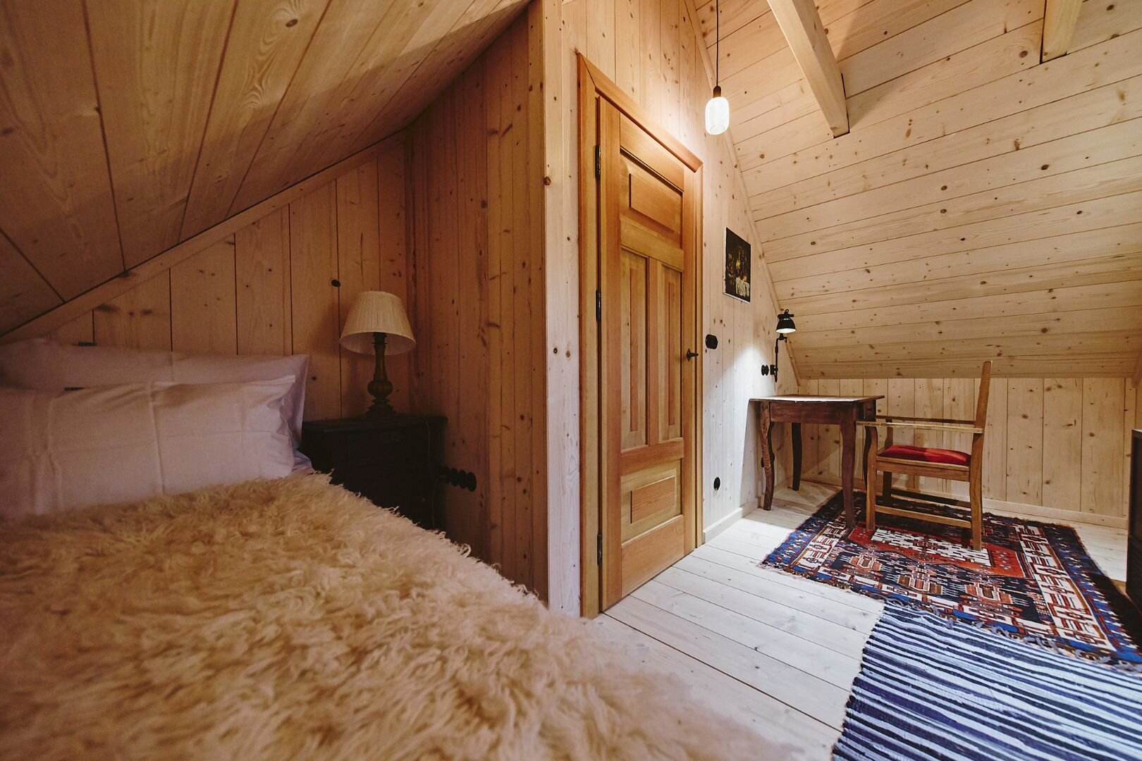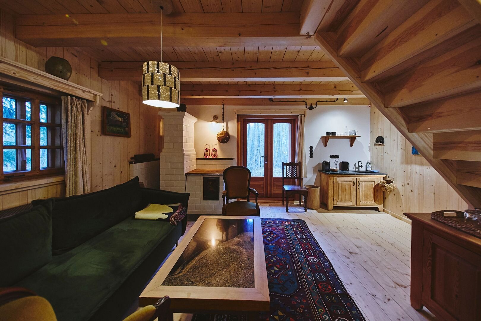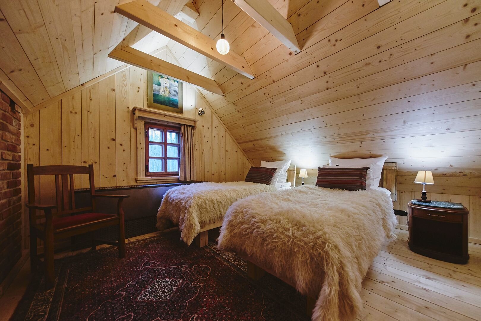 Pokój "Żuraw" to obszerne i przytulne wnętrze, idealne dla maksymalnie trzech osób. Oferuje komfortowe łóżko małżeńskie na antresoli oraz rozkładaną sofę. Luksusowa łazienka jest wyposażona w ręczniki, szlafroki i kosmetyki. Dodatkowo pokój posiada ekspre