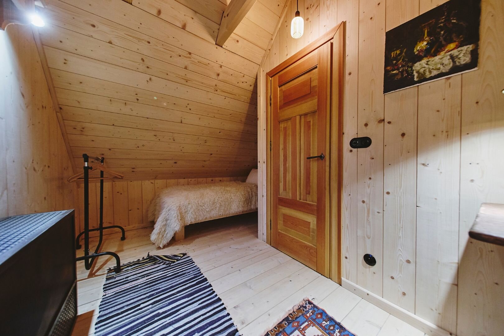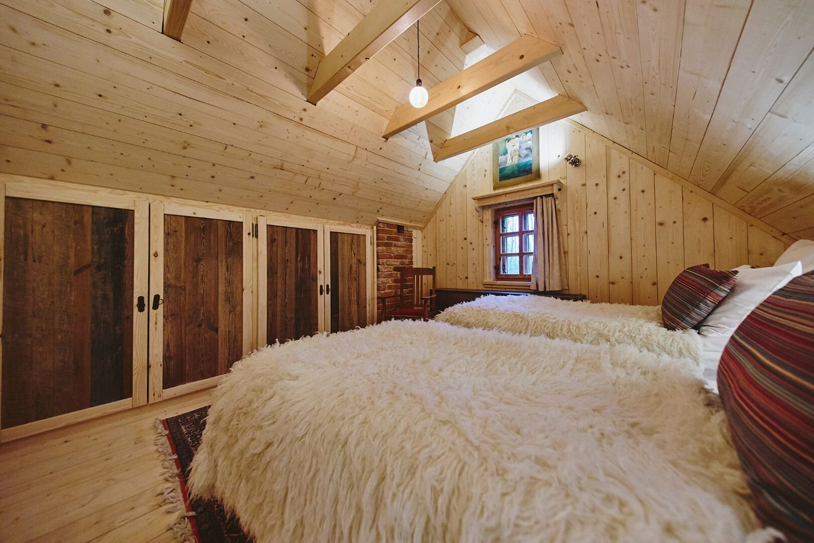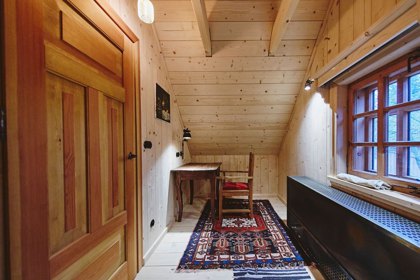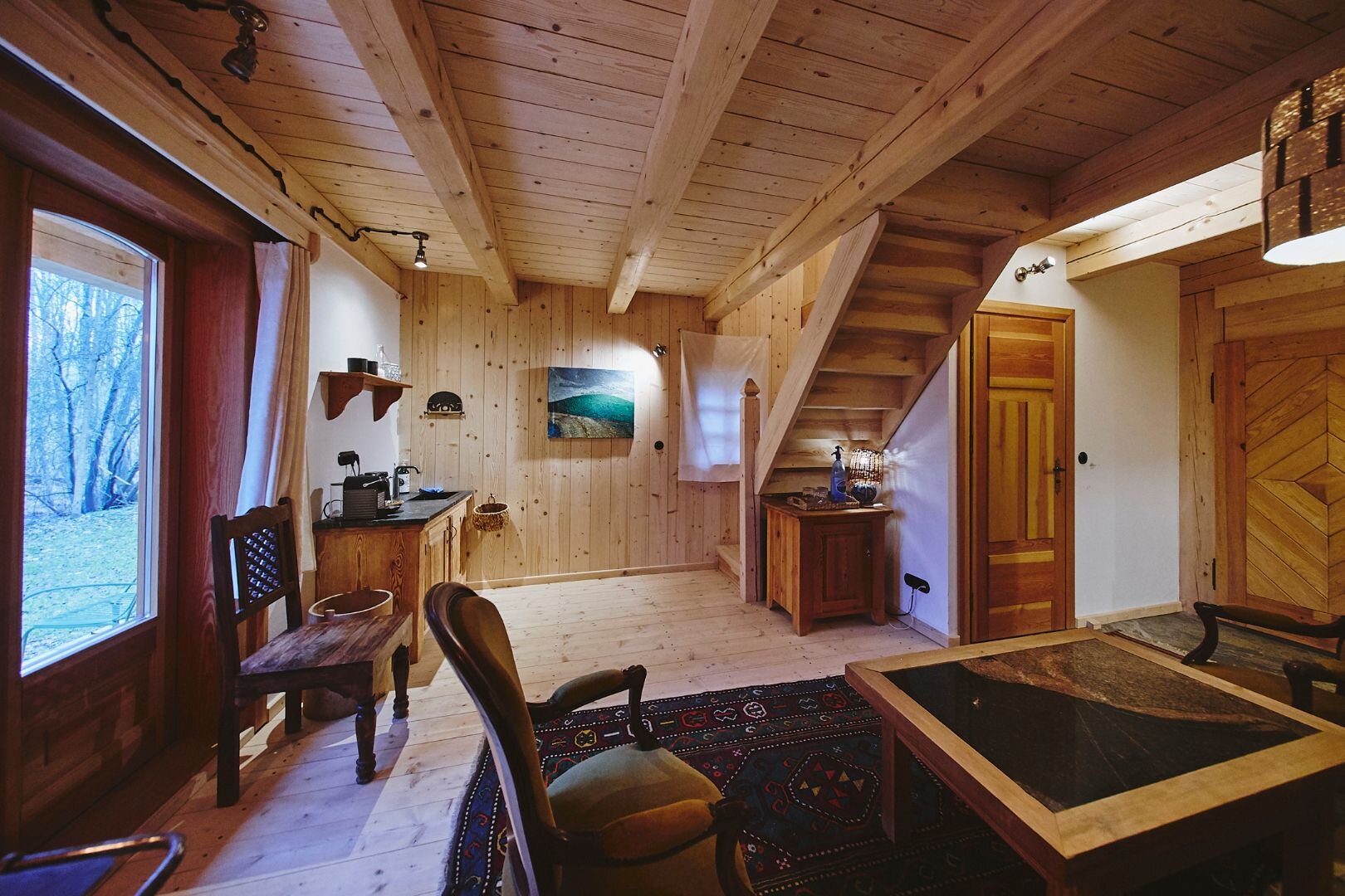 Pokój "Żuraw" to obszerne i przytulne wnętrze, idealne dla maksymalnie trzech osób. Oferuje komfortowe łóżko małżeńskie na antresoli oraz rozkładaną sofę. Luksusowa łazienka jest wyposażona w ręczniki, szlafroki i kosmetyki. Dodatkowo pokój posiada ekspre